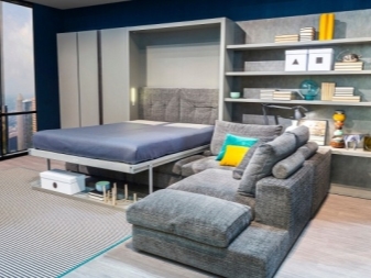 حل عملي لغرفة نوم وغرفة معيشة مستطيلة – تحويل الأثاث ، سرير يمكن إزالته إلى مكان مخصص للحائط وتفكيكه فقط في المساء أو حسب الحاجة. خيار آخر هو أريكة تتكشف في المساء ، وتستقبل الضيوف في الصباح أو بعد الظهر..