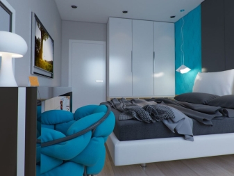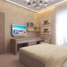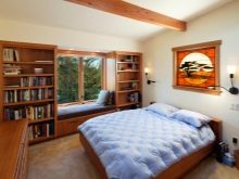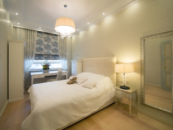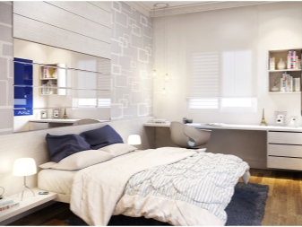 إذا كانت غرفة النوم لا تحتوي على الكثير من الأثاث ، وبصرف النظر عن السرير وزوج من الركائز وخزانة ملابس صغيرة ، فلا يوجد شيء آخر ، فيمكنك التفكير في تنظيم خزانة صغيرة. بعد كل شيء ، لا يحتاج إلى مساحة كبيرة ، حيث يكفي بضعة أمتار لتثبيت مكتب وكرسي للكمبيوتر. يجب أن يكون هناك إضاءة إضافية في هذا الجزء من الغرفة. يمكن أن يكون مصباح طاولة أو مصباح LED أعلى اللوح الأمامي..