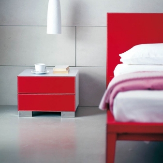 - إذا كنت تريد التطبيق العملي في الداخل ، يمكنك استخدام الجوانب الأساسية الطراز الحديث. للتثبيت المعتاد لهذا النمط في الداخل ، كقاعدة عامة ، يتم استخدام مجموعة أثاث قياسية. يمكنك بنجاح إرفاق طاولتين بجانب السرير بتصميم بسيط إلى حد ما.