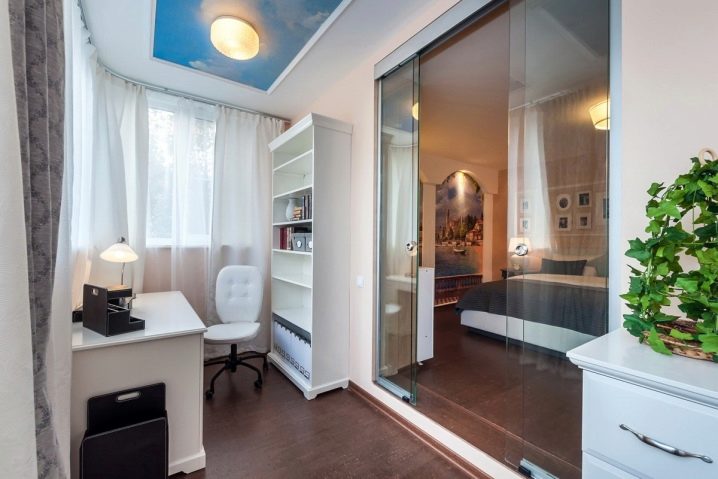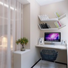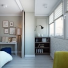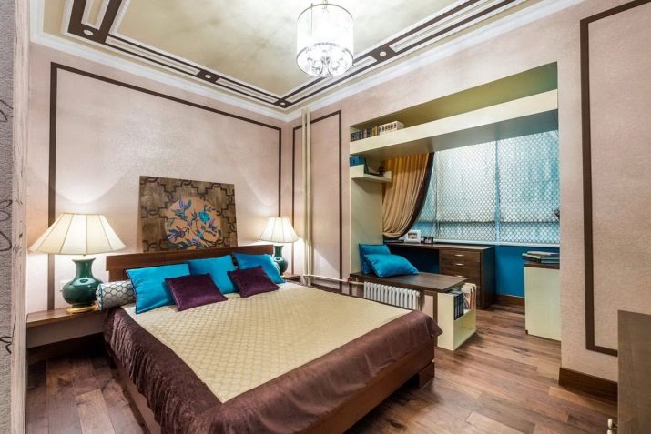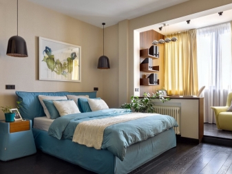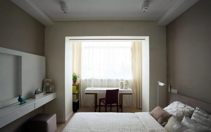 تركيب قوس على هذا القسم شائع. إذا كنت تخطط لوضع منطقة عمل على الشرفة المدمجة ، فقم بتزيين غرفة النوم بألوان هادئة. يجب أن يدعم جزء العمل في الغرفة سير العمل ، لذا انتبه إلى الألوان الغنية..
