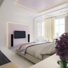 المسارح الرئيسية ذات الشاشة الكبيرة التي تشغل جدارًا بأكمله شائعة. ينصح المصممون بتزيين الغرفة بالستائر التي يمكن أن تغمق الغرفة. بمساعدة المنسوجات ، لا يتم تغطية النوافذ فحسب ، بل أيضًا الجدران. يتأثر نظام الألوان فقط بتفضيلات أصحاب غرفة النوم. يمكنك اختيار ظلال هادئة ، أو العكس ، ظلال مشرقة. ستساعد الستائر ذات المنسوجات على إضافة تنوع حتى إلى غرفة النوم الصغيرة المزينة بأناقة شيوع.