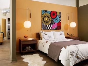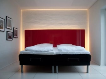 يجب ألا ننسى أهمية الإضاءة في منطقة النوم. بعد كل شيء ، يجب أن يكون لهذا المكان ضوء خافت خاص من شأنه أن يخلق جوًا حميميًا. لذلك ، بالإضافة إلى الثريا المركزية ، يجب أن تكون هناك مصابيح بجانب السرير في الغرفة أو يجب إرفاق شريط LED برأس السرير..