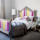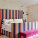 - يمكن للشخصيات المشرقة وغير العادية اختر سريرًا بألوان قوس قزح بظهر مرتفع. سيكون من الجيد وضع مقعد وردي أو أزرق عند القدم ، وتعليق الستائر بزخارف ملونة على النوافذ.
