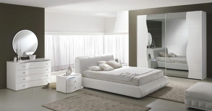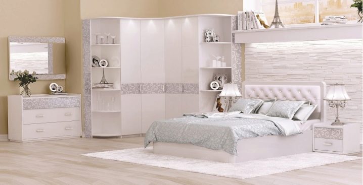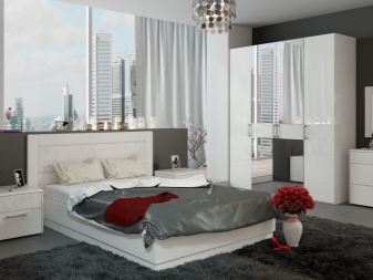 غرفة النوم هذه لها عيب واحد فقط. يتطلب اللمعان موقفًا دقيقًا بشكل خاص. على مثل هذا السطح ، يمكن أن تظهر الخدوش والخدوش حتى من بضع حركات محرجة أثناء التنظيف..