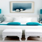 يتناقض الفيروز بشكل فعال مع اللون الأبيض. ومع ذلك ، لا تزين جدران غرفة النوم بهذا الظل. من الأفضل دمجه مع البيج أو البني أو الرمادي كتفاصيل ولهجات مشرقة..