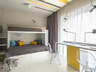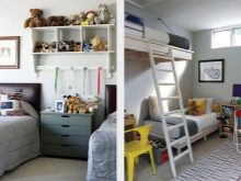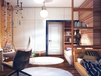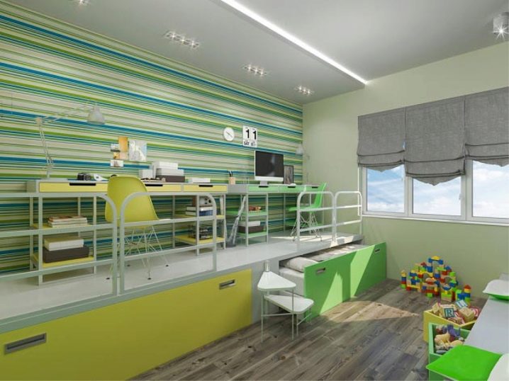 كما أن إنشاء منطقة مشتركة للألعاب في مثل هذه الحالة لا معنى له. يكفي تخصيص منطقتين منفصلتين للنوم ، مكان عمل لطفل أكبر سنًا ، ومنطقة لعب للأطفال الأصغر سنًا..