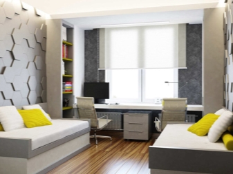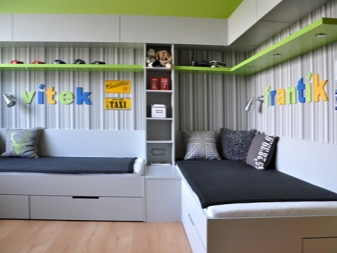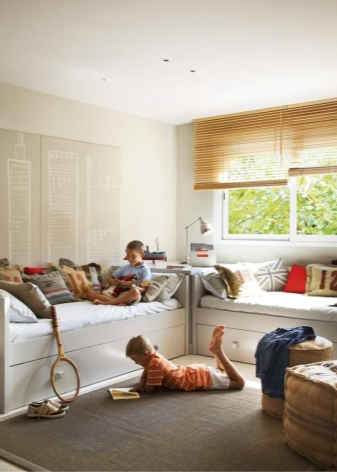 عند تزيين غرفة لأطفال المدارس ، من المهم جدًا تنظيم أماكن العمل بشكل صحيح ومريح – يجب أن يكون لكل من الأخوة طاولات وكراسي ورفوف كتب منفصلة خاصة بهم. من المهم أيضًا الاهتمام بجودة الإضاءة. لكن يمكن للصبيان الاسترخاء واللعب في منطقة الاستجمام المشتركة..
