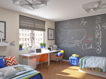 بالنسبة للأطفال الصغار ، ستكون الخلفيات الخاصة التي يمكنك الرسم عليها مناسبة جدًا. يمكن لصق هذه الخلفيات في المنطقة المشتركة للألعاب. يحب الأطفال أيضًا لوحات الرسم المختلفة. يمكنك الاعتماد عليها بالطباشير ، وكذلك باستخدام أقلام فلوماستر..