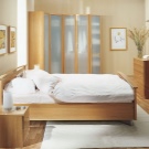 يمكن أن تكون الأبواب مصنوعة من الخشب أو لها سطح مرآة أو بلاستيك. بالنسبة لغرفة النوم هذه ، فإن الأسرة المنخفضة بدون اللوح الأمامي مناسبة. من الضروري تثبيت طاولة بجانب السرير أو طاولة بالقرب منهم. لا حاجة لأي شيء آخر. حاول إبقاء مساحة الغرفة مفتوحة قدر الإمكان..