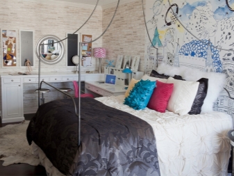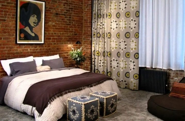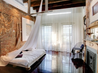 التصميمات الداخلية غير العادية ملهمة. يجدر الاستمتاع بالحلول الممتعة للمصممين ومعرفة كيفية إنشاء جدران من الطوب في غرف النوم. تتناغم أعمال الطوب الخشنة مع الأقمشة الخفيفة الخفيفة – ستائر على النوافذ ونوع من المظلة فوق السرير. السرير والجدار هنا عكس الأثاث المتطور في الطرف الآخر من الغرفة..
