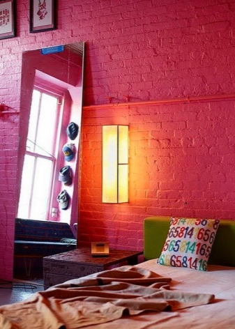 يجمع المصممون بمهارة بين الطوب الأحمر الكلاسيكي وتشطيبات الغرف البيضاء والرمادية. الجدار المطلي باللون الأحمر أو الوردي هو خطوة جريئة. إنه مناسب للتصميمات الداخلية الحديثة أو حتى فن البوب. يعتبر الطوب الأرجواني مثاليًا للحداثة ، ولكن بعد ذلك تحتاج إلى التقاط العديد من الملحقات في نفس الظل – على سبيل المثال ، أريكة ناعمة أو سجادة.