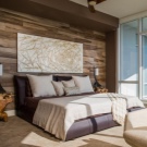 تسمح لك الألواح المصفحة بتجربة التصميم الداخلي لأي غرفة ، بما في ذلك غرفة النوم. يلفت غطاء الجدار هذا الانتباه إلى نفسه ويحول الغرفة. تصبح غرفة النوم أكثر دفئًا ودفئًا. من الجيد قضاء الكثير من الوقت في مثل هذه الغرفة..