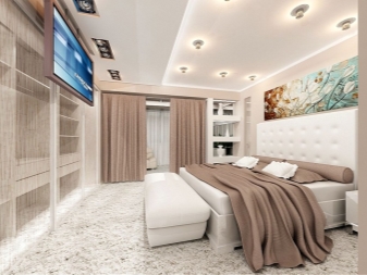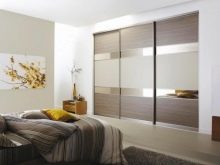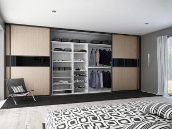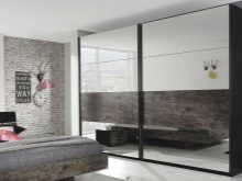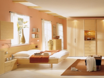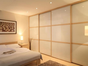 أيضًا ، غالبًا ما يستخدم الأثاث المصنوع حسب الطلب تصميم خزانة مدمجًا. هذا يعني أن دور جدارين للخزانة يتم لعبه بواسطة جدران غرفة النوم ، والرابع مصنوع من مواد الأثاث..