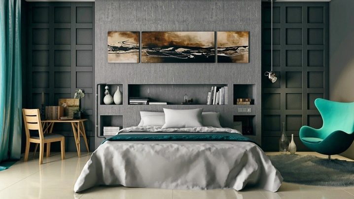 - في غرفة النوم بجدران رمادية سيبدو الأثاث ذو لون الخشب الطبيعي رائعًا. لهجة مشرقة في مثل هذا التصميم الداخلي ، يمكنك صنع كرسي بذراعين في ظل الفيروز..