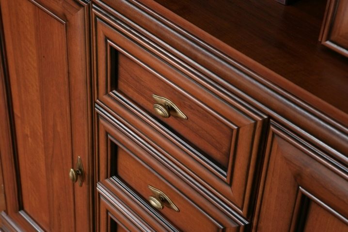 لكن الأثاث المصنوع من اللوح الرقائقي لا يسمح بقطع أي زخرفة عليه ، وبالتالي فإن الألواح متساوية تمامًا. الشيء الوحيد الذي تم تزيينها به هو العناصر الملصقة من البلاستيك والحجر.