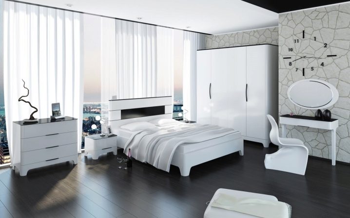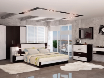 - غالبًا ما يستخدم المصممون أثاث غرف النوم. بالابيض والاسود. يعتبر هذا المزيج كلاسيكيًا ولا يبدو مملاً على الإطلاق. يتم تخفيف كل شدة هذا التصميم بسهولة بلهجة مشرقة صغيرة على شكل مزهرية من الزهور أو وسادة. في الوقت نفسه ، يمكن أن يكون الأثاث غير لامع ولامع..