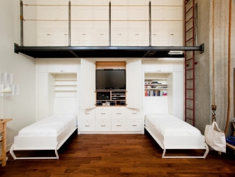 الأثاث المحول جديد في سوق الأثاث. يكون هذا مناسبًا بشكل خاص عندما لا تحتوي غرفة النوم على هذه الوظيفة فحسب ، بل هي عبارة عن مكتب أو مدمجة مع غرفة معيشة ، وغالبًا ما يوجد هذا في شققنا الصغيرة. يسمح لك بوضع سرير كامل حتى في أصغر غرفة نوم أو دفع الطاولة للعمل وإخفاء الكراسي أسفل السرير ، والتي عادة ما تسد الممر..