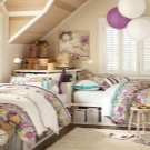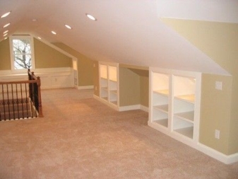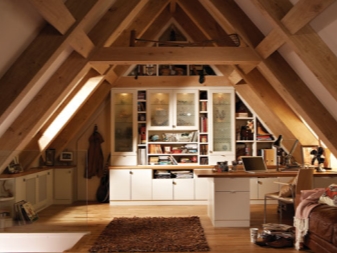 لا يسمح شكل السقف باستخدام الأثاث العادي في الترتيب ، ولا توجد طريقة لوضعه على طول الجدران. لاستخدام أكثر عقلانية للمساحة ، هناك حاجة لتصنيع أثاث مدمج بأحجام فردية ، والذي سيكون موجودًا في منافذ تشكل سقفًا مائلًا.