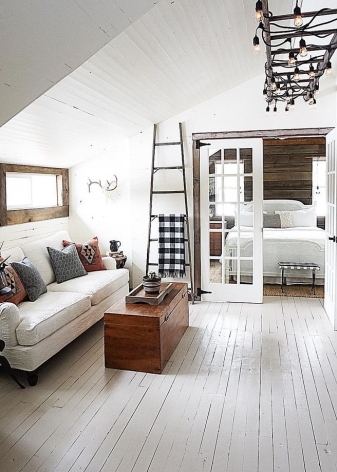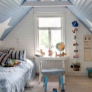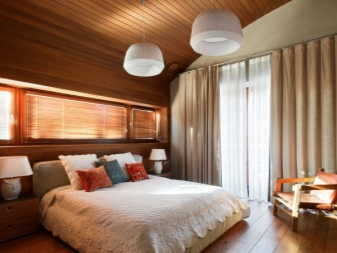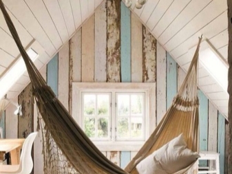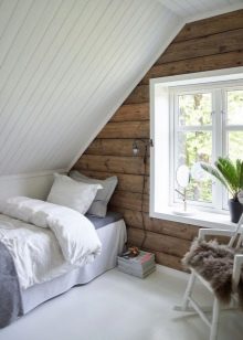 من مساحة العلية الصغيرة ، يمكنك إنشاء غرفة بيضاء نقية. من الأسهل الحفاظ على النظام في العلية ، التي تقع بعيدًا عن المدخل ، مقارنة بالطوابق السفلية. تستخدم الظلال الخشبية في تكسية الأسقف. ارتفاع سقف العلية يجعل من الممكن تعليق المصابيح الحجمية. والمنسوجات ذات الألوان الزاهية والمفروشات الزاهية للأثاث ستخفف الخلفية الرئيسية لظلال الخشب.