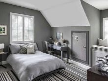سيكون الحل الأصلي غرفة نوم رمادية. ربما يستخدم الجزء الداخلي مجموعة كاملة من ظلال اللون الرمادي. يعطي هذا المقياس إحساسًا بالطيران. يستخدم ديكور الأسطح المائلة طبعة بالريش.