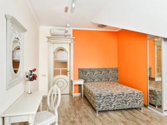 - يجب تزيين الجدران بلون فاتح رقيق (طلاء أو ورق حائط). في نفس الوقت ، يمكن أن يكون تصميم الجزء المركزي في الغرفة بألوان زاهية. ولتوسيع المساحة ، يمكن طلاء الجزء العلوي بلون مغاير..