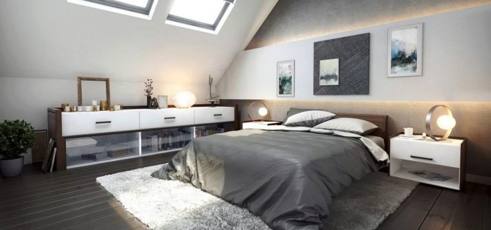 دائمًا ما يكون الجزء الداخلي من غرفة النوم هذه محدودًا بسقف مائل ، وأحيانًا غير متماثل. هذا يعقد مهمة ترتيب الأثاث..
