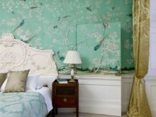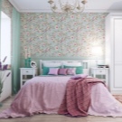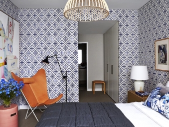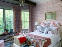 إذا كنت قد زينت الجدار بالقرب من السرير بأنسجة ، فلا تتردد في الجمع بين الطباعة على بقية الجدران مع غطاء السرير. إذا كانت هناك كراسي في الغرفة ، فيمكنك الجمع بين نمط ولون التنجيد والستائر. هذه اللمسة الصغيرة ستجعل غرفتك أكثر راحة..