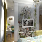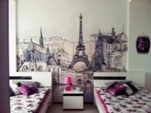 - تبدو أغطية الجدران رائعة الجمال مع صور مشاهد من الحياة. تساعد حلول التصميم هذه على “إشباع” الغرفة تمامًا بروح فرنسا وجعل مظهر غرفة النوم أصليًا حقًا.