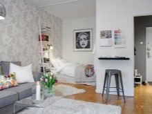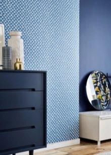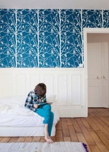 في حالة وجود غرفة صغيرة ، سيكون عليك البحث عن طرق أخرى. بدلاً من ذلك ، يمكن لصق ورق الحائط باستخدام الطريقة المدمجة. سيساعد ذلك في جعل غرفة ضيقة بصريًا أكبر قليلاً ، وتوسيع المساحة ، وجعل السقف أقل أو أعلى ، وتقسيم الغرفة إلى مناطق (على سبيل المثال ، منطقة عمل وترفيه).
