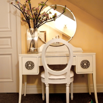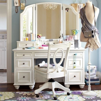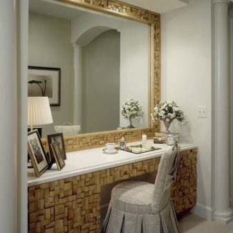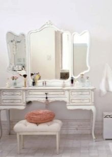 نقطة مهمة – المعدات. كما هو مذكور أعلاه ، يتم بيع الكراسي والوسائد المصنوعة بنفس طراز القاعدة جنبًا إلى جنب مع منضدة الزينة. يوصى بإعطاء الأفضلية لمثل هذه الخيارات فقط ، حيث ستبدو متناغمة في الداخل..