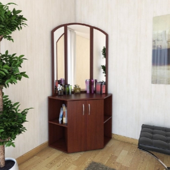 خيارات الركن صغيرة الحجم ، لكنها ذات سعة جيدة. تشغل طاولات الزينة هذه مساحة أقل (على عكس المنتجات المستطيلة).