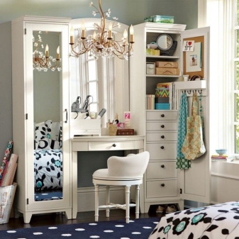 لا تعتمد العديد من المنتجات على المرآة فحسب ، بل تعتمد أيضًا على عدد كبير من الأجزاء الإضافية. تجدر الإشارة إلى أن صناديق التخزين لا يمكن أن تكون فقط في منضدة الزينة نفسها ، ولكن أيضًا في وسادة ، والتي غالبًا ما يتم تضمينها في المجموعة..