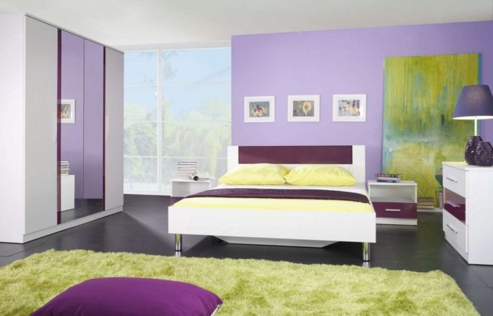 حتى لا تبدو غرفة النوم ذات اللون الأرجواني العادي مملة للغاية ، يجب استكمالها بلمسات مشرقة. تقريبا أي تفاصيل يمكن أن تكون بمثابة لهم. غالبًا ما تكون هذه وسائد أو بطانيات زخرفية زاهية. يمكنك أيضًا استخدام سجادة صغيرة منفوشة بلون غني لهذا الغرض..