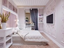 ستتمتع الغرفة المزينة بهذه الطريقة بجو رومانسي لطيف. وسيكون مريحًا جدًا للراحة هنا. يمكن أيضًا استكمال الغرفة بالخضرة الطبيعية ، أي الزهور الطازجة..