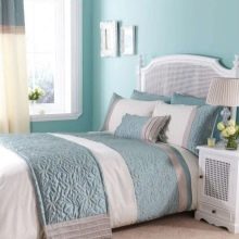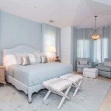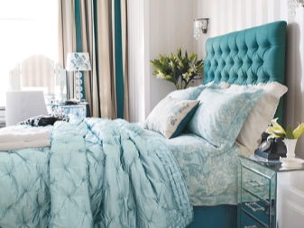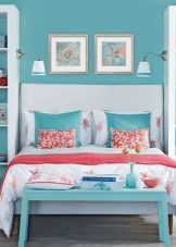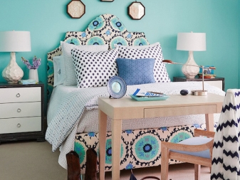 يمكن استخدام مجموعة الألوان الفيروزية الرائعة والمقيدة في العديد من الاتجاهات الأسلوبية. يمكن تزيين غرفة النوم بألوان زرقاء بطريقة حديثة. يمكن تحقيق ذلك باستخدام خطوط وأشكال بسيطة في الديكور ، والحد الأدنى من التفاصيل وبعض السكتات الدماغية الساطعة ، جنبًا إلى جنب مع مقياس أزرق سماوي..