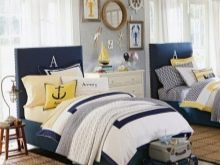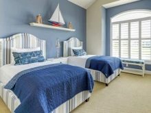 يمكن تزيين غرفة النوم بألوان زرقاء بطرق مختلفة ، وهذا يعتمد على كيفية دمج لوحة الألوان. في هذا التصميم ، تشبع اللون الأزرق ، واستخدام خطوط على الجدران ، وديكور على موضوع معين ، وزخارف وإدخالات من نجم البحر وسكان العالم تحت الماء ، ولوحات حول موضوع الغواصات وعناصر الفضاء تحت الماء – الكل سيصبح هذا حلًا مثيرًا للاهتمام.