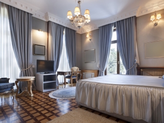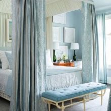 لتزيين الشقق الملكية ، كقاعدة عامة ، يختارون ستائر غنية وفاخرة ، مع ستائر زخرفية أفقية (لامبريكين) تمتد على طول الجزء العلوي من الستائر. يجب أن يتناسب هذا القماش مع نغمة مظلة السرير..