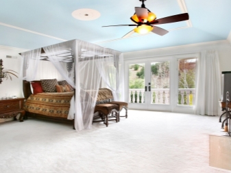 نظام الألوان السماوي للسقف متناغم للغاية. حتى لو كانت الغرفة صغيرة ، فإن هذا السقف سيجعلها أكثر اتساعًا بصريًا. هنا تحتاج إلى الاستغناء عن التناقضات الحادة ، وبالتالي يوصى بتزيين السقف والجدران بنفس اللون. من الأفضل أن يكون السقف مطليًا بنفس لون الجدران ، ولكنه سيختلف بعدة ظلال. من الأفضل تزيين التداخل باللون الأبيض..