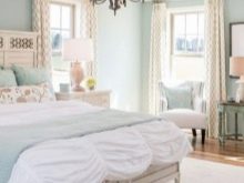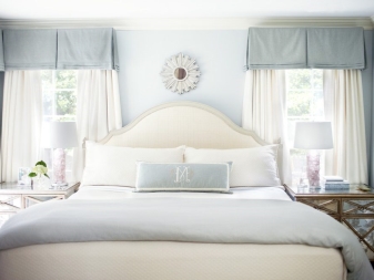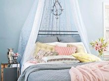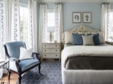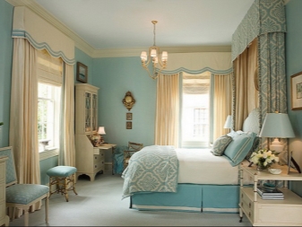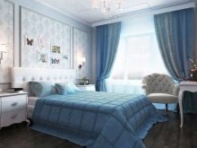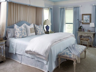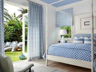 بالنسبة لغرفة النوم بألوان زرقاء ، سيكون الخيار الأفضل هو الستائر الزرقاء مع تثبيت على الثقوب والتول بلون أبيض ثلجي..