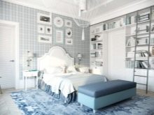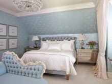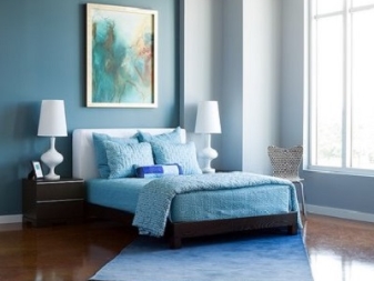 يمكن أن تكون خلفية غرفة النوم الزرقاء الصلبة فيروزية أو أرجوانية أو حتى رمادية. في مثل هذه الغرفة ، ستبدو كل التفاصيل محكمًا ، وستعطي اللوحة باللون الأزرق للداخل رفاهية معينة..