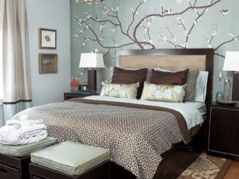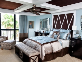 في غرفة نوم حديثة بألوان زرقاء مع أثاث بني (كقاعدة عامة ، تكون مادة تصنيعها من الخشب الطبيعي) ، ومع ألوان الشوكولاتة في المنسوجات ، ستشعر دائمًا بالراحة والراحة. وستتماشى الجدران ذات الظل الأزرق بشكل جيد مع سرير خشبي ضخم داكن ، وخزانة جانبية وخزانة ذات أدراج مصنوعة من نفس المادة..