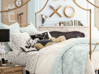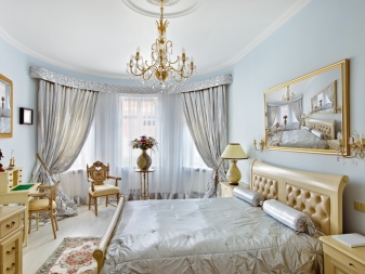 سيكون هناك أيضًا ملاحظات ذهبية – أنماط على قطع الأثاث ، والستائر المهدبة ، وإطار المصباح. ستضيف التفاصيل المتلألئة ألوانًا جديدة إلى الغرفة ، وستصبح المفروشات أكثر فخامة ، خاصةً إذا كانت غرفة النوم مزينة بأسلوب كلاسيكي..