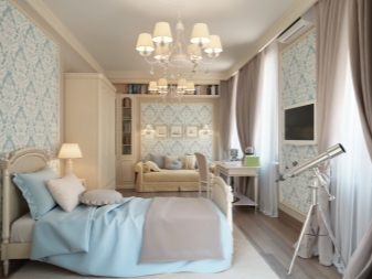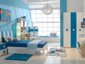 يُسمح بوجود لهجة مشرقة في غرفة ذات تشطيب أزرق على الستائر ، ومن المستحسن أن تكون الرسومات عليها وأغطية الأسرة وعلى أي ملحق آخر بنفس النغمة.