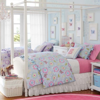 لتحقيق التوازن بين المظهر ، تم صنع غطاء السرير والستائر والأنماط الموجودة على سطح خزانة الملابس باللون الوردي ، والذي يبدو مثاليًا في تركيبة مع زرقة الجدران. تذكرنا هذه الظلال بالأسلوب الرجعي ، وهذا يجعلها أنيقة بشكل خاص..