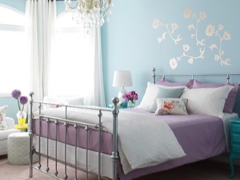 في الظلال البنفسجية ، تكون النغمة غنية بشكل خاص ، وبالتالي ، بالاقتران مع اللون الأزرق ، ينشأ لغز معين في الداخل. في النطاق الأزرق الباهت لغرفة النوم ، ستجلب الظلال الأرجواني إحساسًا بشيء مشرق وفاخر..