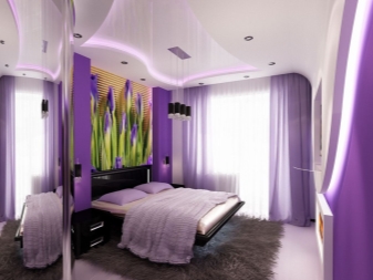 عادة ما تكون الألوان الباردة في غرفة النوم غير مرحب بها. لكن هذا العام ، في ذروة الشعبية ، كان اللون الرمادي والجوز والبني والأرجواني على وجه الخصوص. تتراوح درجات اللون البنفسجي من شاحب إلى فاتح. غرفة النوم محاطة بستائر بألوان ناعمة: بنفسجي ولافندر.