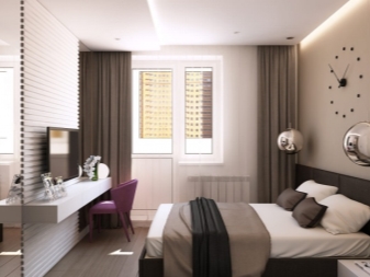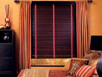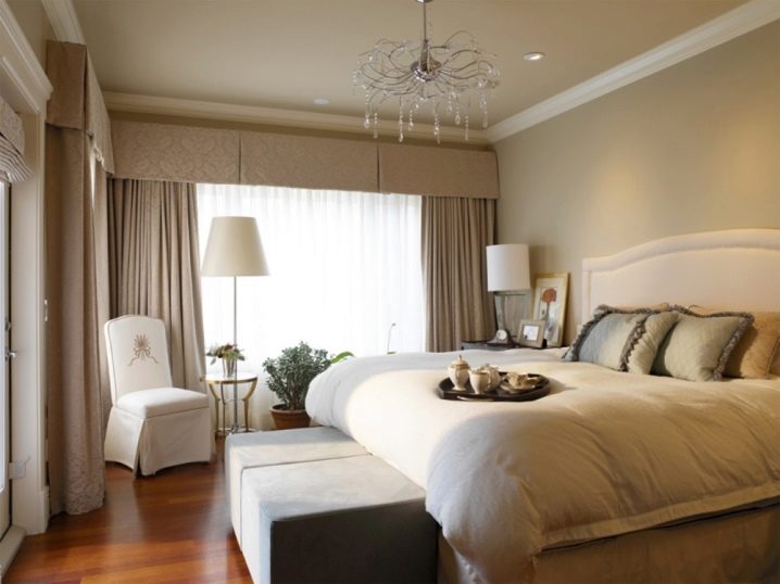 تم التأكيد على الزخرفة الصارمة للغرفة من خلال الستائر الثقيلة ، والمساحة جيدة التهوية مزينة بمنسوجات خفيفة مع ربطات خلفية مصنوعة من شرائط أو حلقات. علاوة على ذلك ، يُنصح المصممون بالتخلي عن الملحقات الإضافية للستائر في غرفة النوم على شكل خرز وشرابات وأقواس وجلد. هم فقط يفرطون في الفضاء مرة أخرى..
