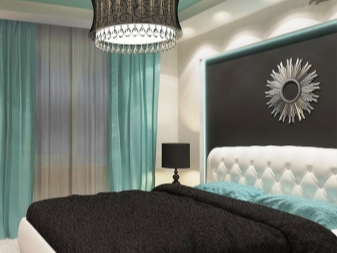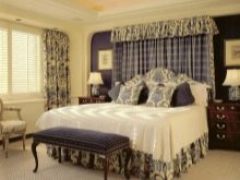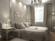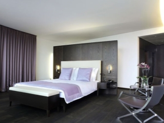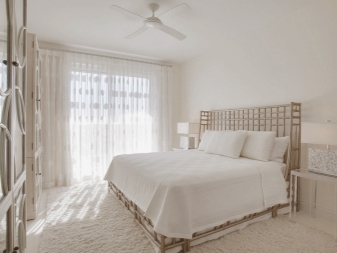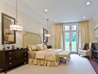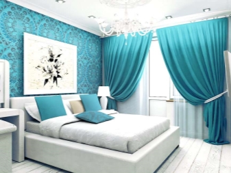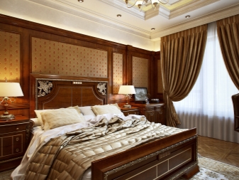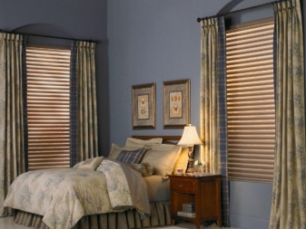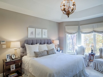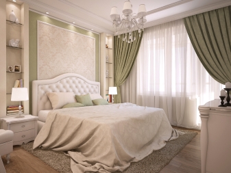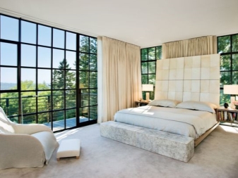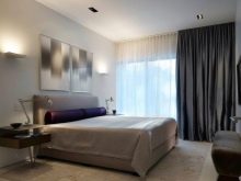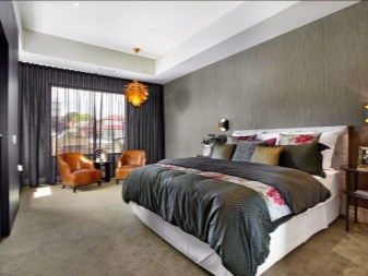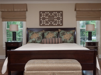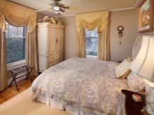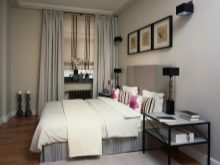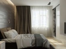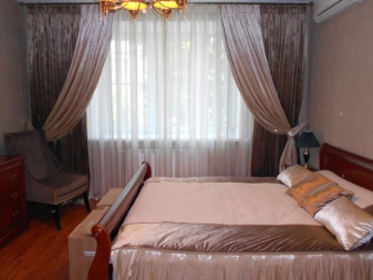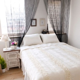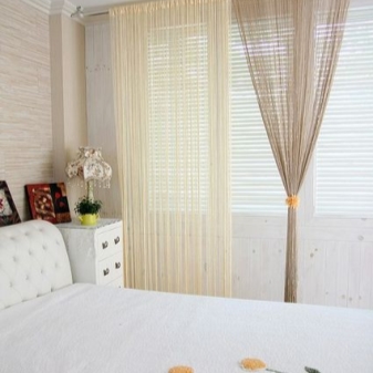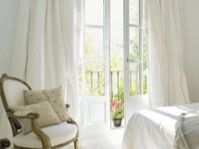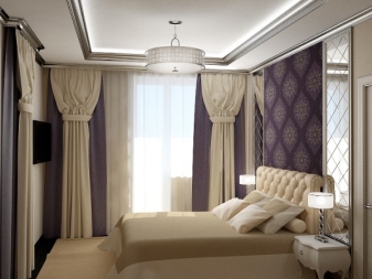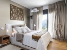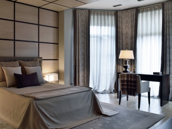 تم التأكيد على الزخرفة الصارمة للغرفة من خلال الستائر الثقيلة ، والمساحة جيدة التهوية مزينة بمنسوجات خفيفة مع ربطات خلفية مصنوعة من شرائط أو حلقات. علاوة على ذلك ، يُنصح المصممون بالتخلي عن الملحقات الإضافية للستائر في غرفة النوم على شكل خرز وشرابات وأقواس وجلد. هم فقط يفرطون في الفضاء مرة أخرى..