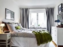 لا يمكن أن تؤدي الستائر الداخلية وظيفة زخرفية فحسب ، بل تؤدي أيضًا وظيفة نمذجة.. باستخدام الستائر المناسبة ، يمكنك بسهولة ضبط مساحة غرفة النوم: اجعلها أعرض أو أضيق أو أعلى أو أقل. يجب ألا تجر الستائر الكثيفة على الأرض ، فكل مظهرها سيقضي على الراحة. لكن الأقمشة الناعمة التي تتدفق على أرضيات الباركيه في موجات ناعمة ستضيف ألفة إلى الجو..