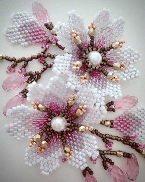 σε λευκό, κίτρινο και ροζ χρώματα. Χρησιμοποιήστε καφέ τόνο και φύλλα φτέρης ως διακόσμηση. Συλλέξτε τους στήμονες λουλουδιών από κίτρινο και καφέ. Συνθέτουμε τους κλάδους χρησιμοποιώντας λευκές χάντρες, όπως φαίνεται στο διάγραμμα 2. Σύμφωνα με την εικόνα # 1, φτιάχνουμε πέταλα. Μετατρέπουμε δύο από αυτά σε μπουμπούκι. Στη συνέχεια, κάνουμε μερικά πράσινα φύλλα (η ακολουθία της ύφανσης τους, το σχήμα 3 θα σας πει).